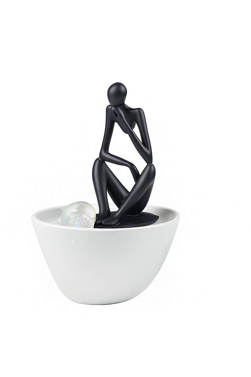- Cette fontaine moderne présente une silhouette artistique noire assise en position de réflexion, apportant une touche élégante et contemporaine à votre intérieur. Installée dans un bassin blanc au design épuré, elle diffuse une ambiance zen grâce au doux écoulement de l’eau et à sa petite sphère lumineuse. Parfaite pour créer un coin détente ou ajouter une note décorative raffinée à votre maison.
