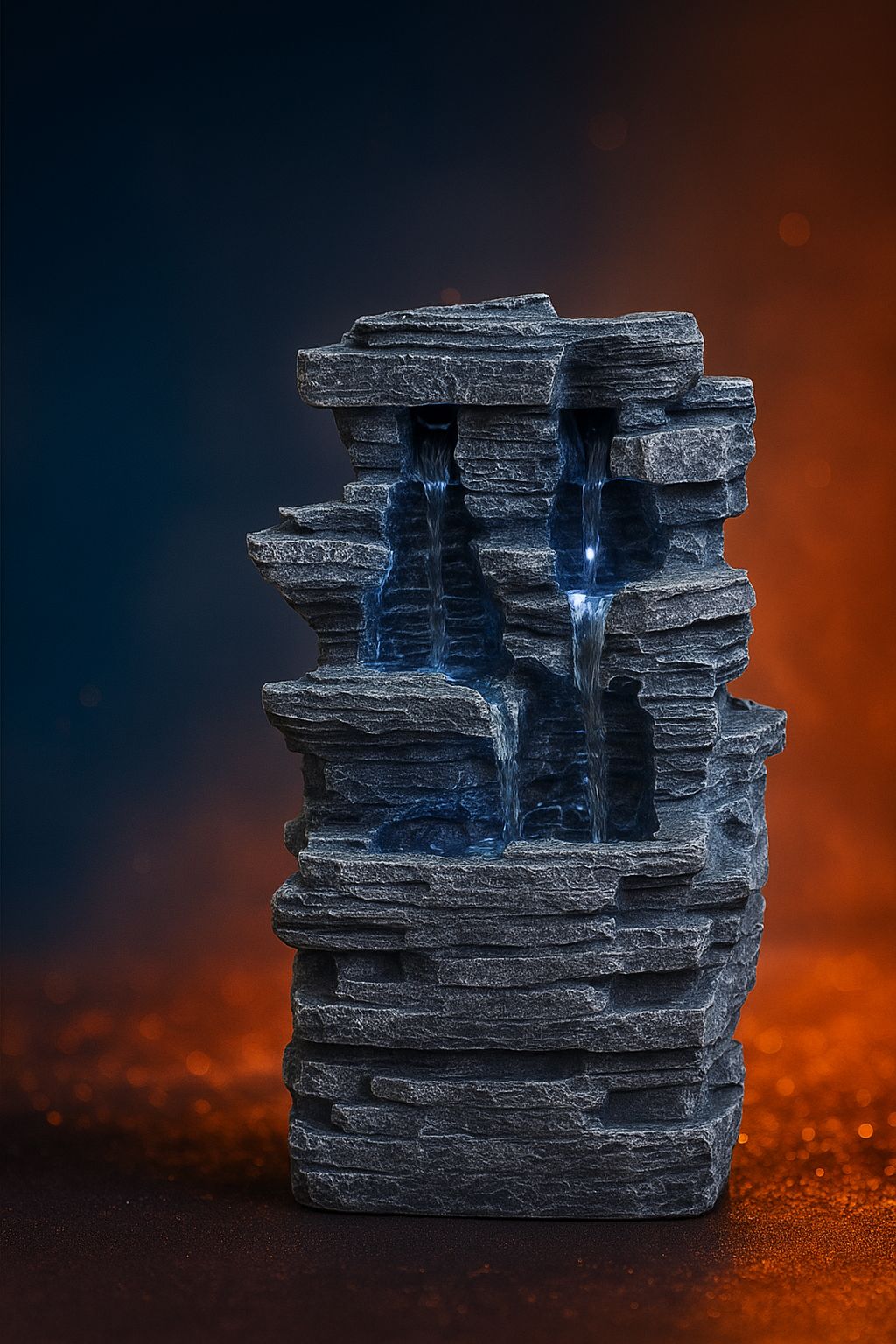 - Vraie cascade. - Très belle imitation de la pierre. - 3 éclairages Led blanc. - Pompe silencieuse.