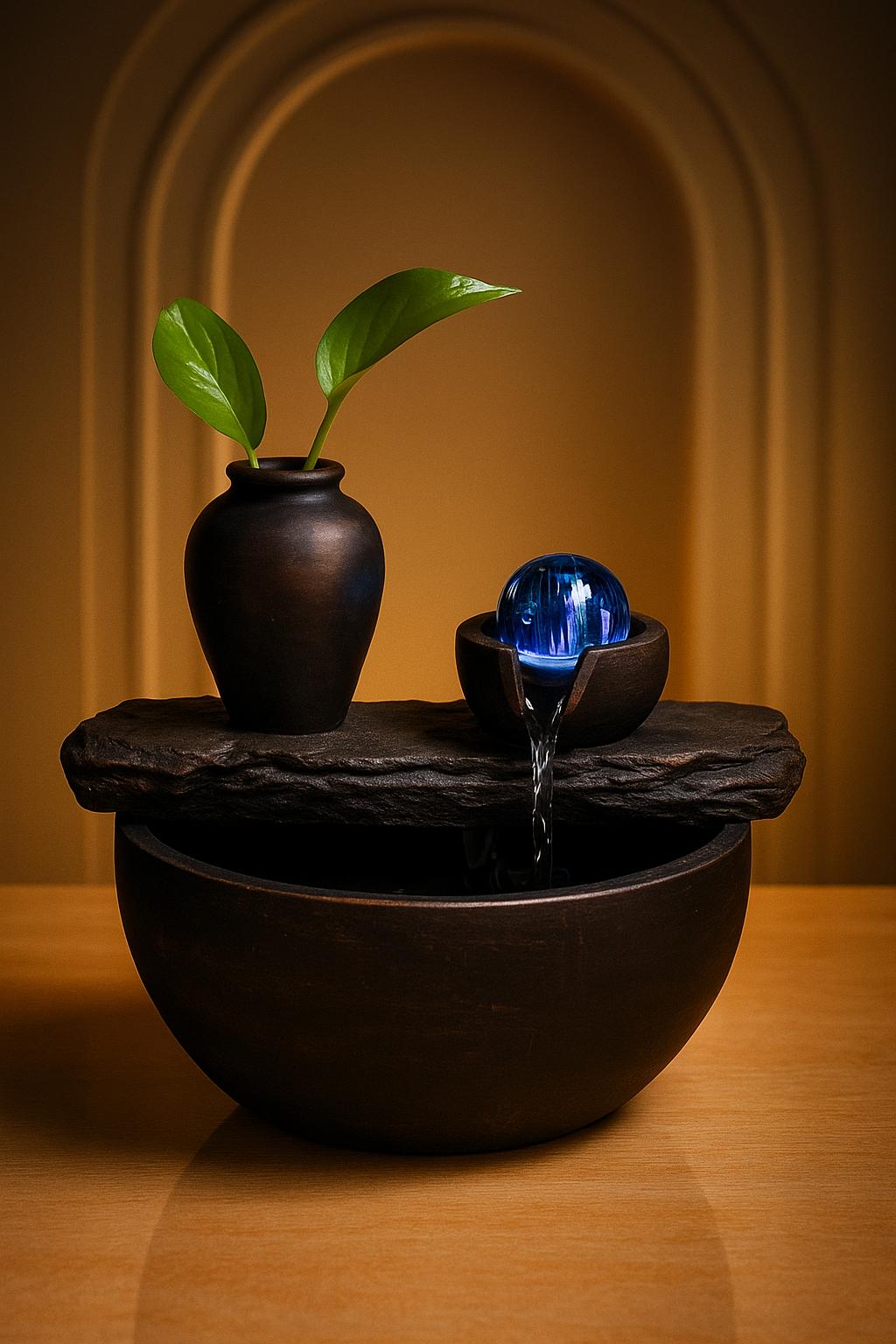 - Contenu: fontaine, vasque, pompe avec led, boule en verre.