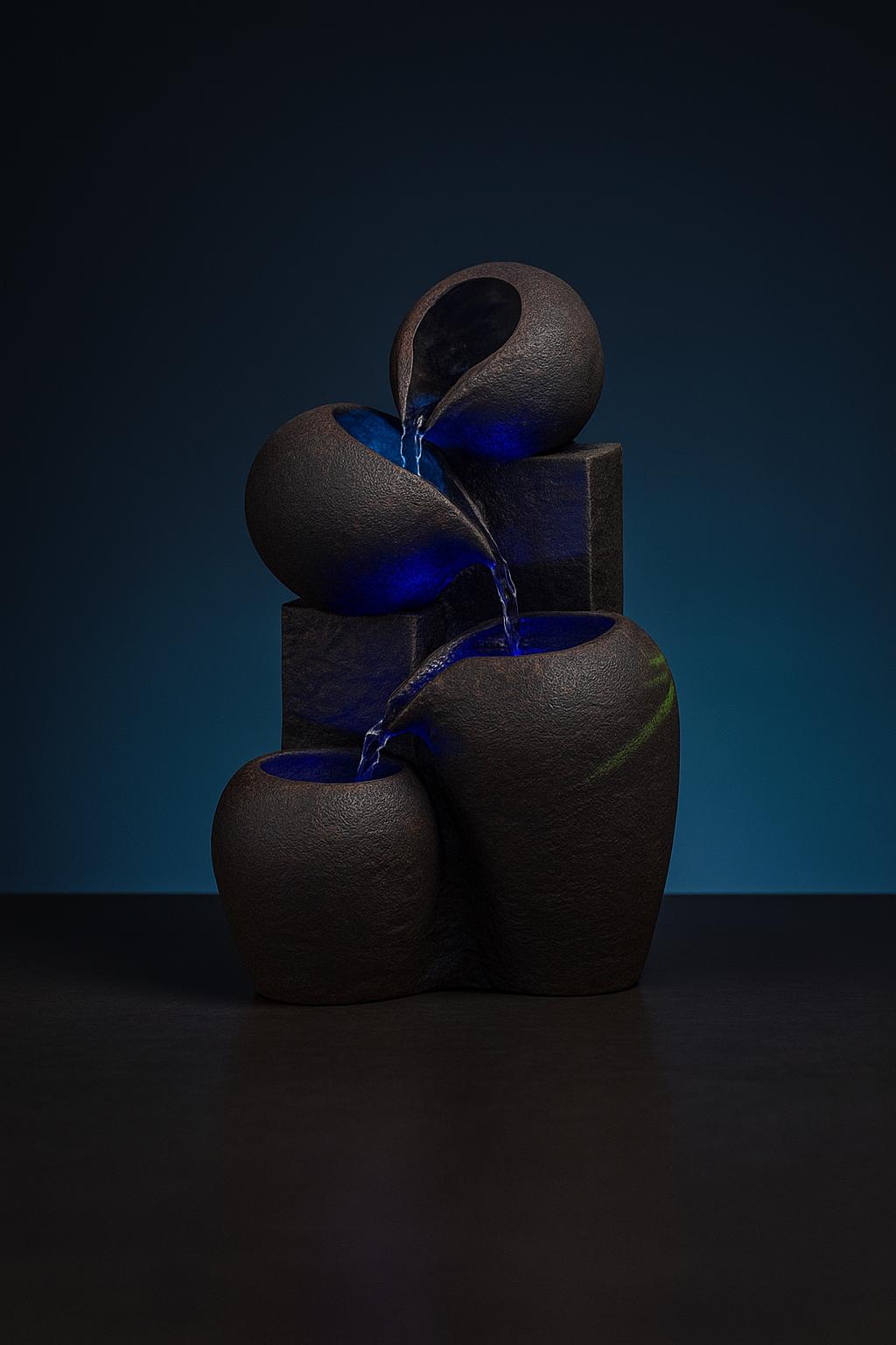- Originalité du design. - Souci de détail. - Jarres en cascade. - Pompe silencieuse. - Eclairage Led à changement de couleur.