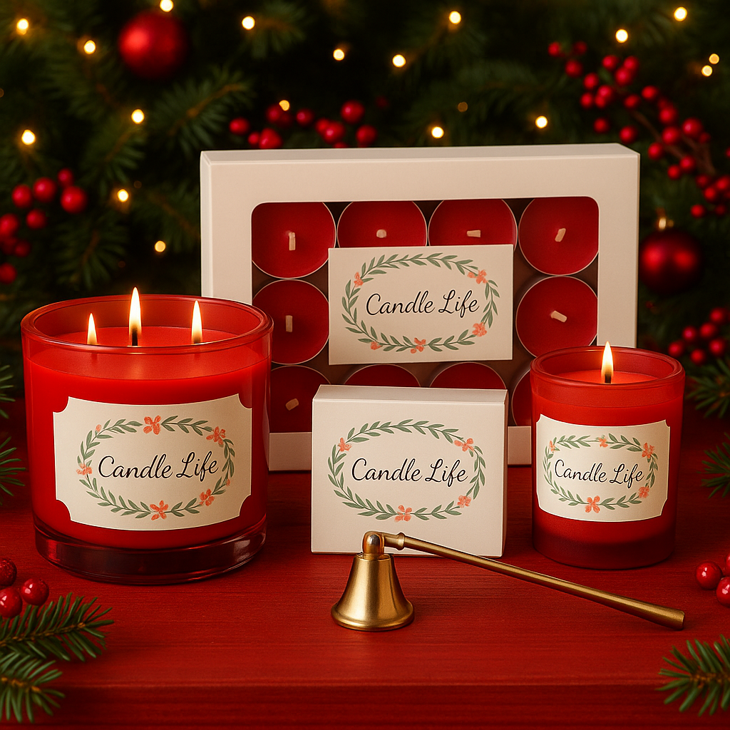 - Découvrez notre coffret de Noël réunissant une grande bougie trois mèches, une bougie mèche en bois, une boîte de 12 réchauds et un éteignoir élégant. L’ensemble est parfumé à la douce senteur Fleur de Noël, créant une ambiance chaleureuse, festive et délicatement parfumée. Un lot complet, idéal pour sublimer vos soirées hivernales ou offrir un cadeau raffiné pour les fêtes.